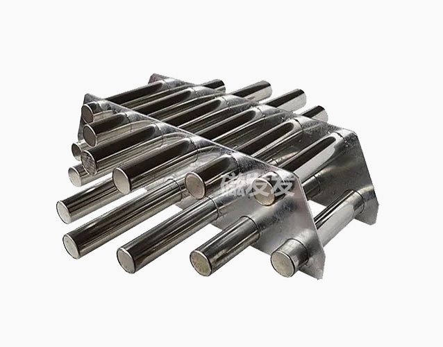 强磁磁力架是由数根永磁材料经过特殊磁路设计的强磁磁力棒组合而构成的产品。磁棒外面用不锈钢套管的结构,正常工作时,物料经过套管,铁磁颗粒被磁棒的磁力吸附到套管上。清理时抽出磁棒,套管上的颗粒由于没有了磁力的吸引而自动落下,节省了擦拭的时间。强磁磁力架广泛应用于塑料,陶瓷,粉料,浆料等除铁设备,磁场梯度设计合理,整体部件都经过严格抛光流程。