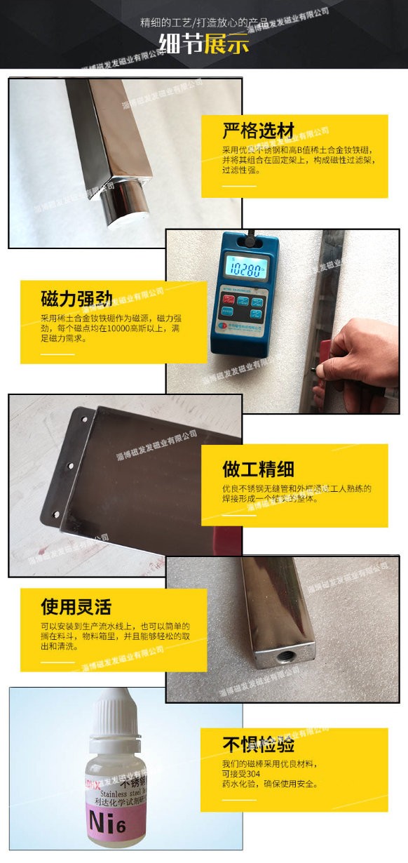 方形磁棒是采用优质不锈钢板材和高B值稀土合金钕铁硼,并采用特殊的制作方法制作而成。可以悬挂在新能源涂布机、分切机、收放机以及输送带、料槽、管道、饲料盘、传送带上方或末端,构成磁性过滤器。当含铁的物质通过时,受到方形磁棒的吸引,将含铁的物质牢固的吸附在板壁上,以保证设备的完好和产品的安全。