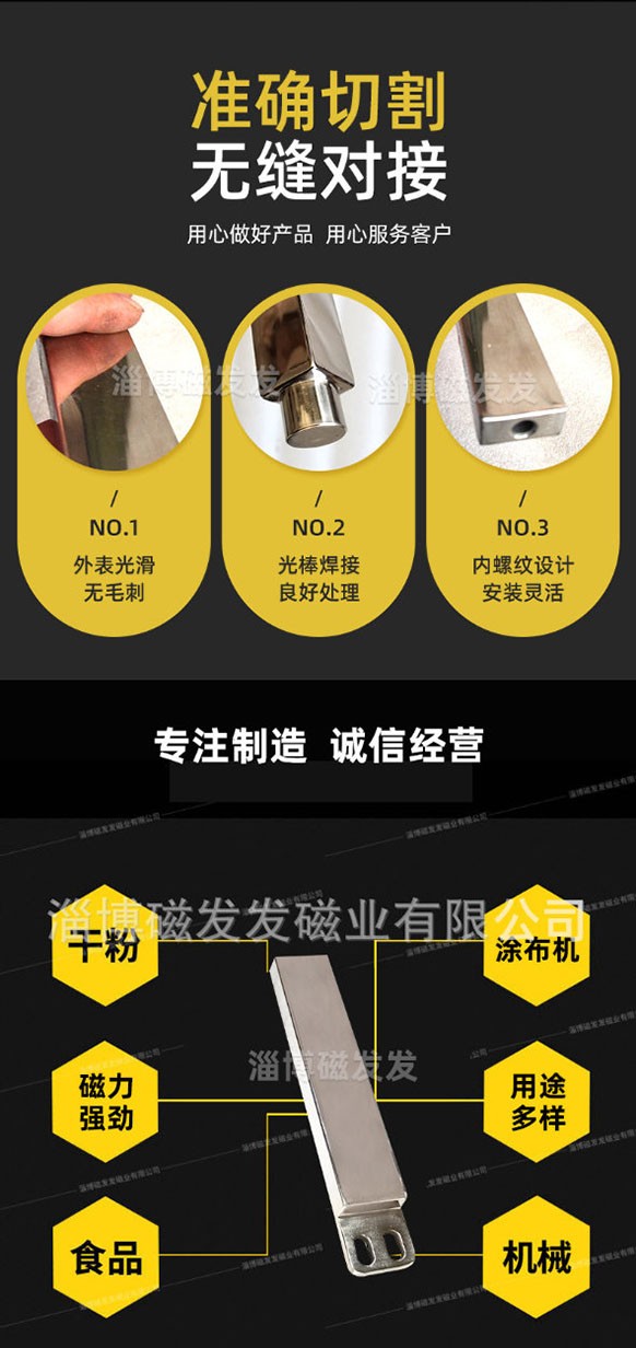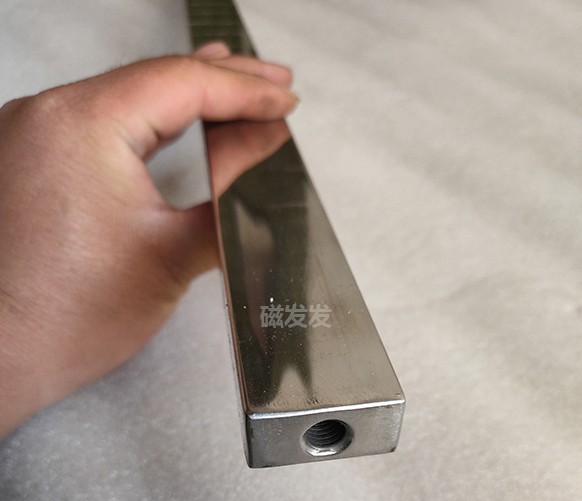 方形磁棒是采用优质不锈钢板材和高B值稀土合金钕铁硼,并采用特殊的制作方法制作而成。可以悬挂在新能源涂布机、分切机、收放机以及输送带、料槽、管道、饲料盘、传送带上方或末端,构成磁性过滤器。当含铁的物质通过时,受到方形磁棒的吸引,将含铁的物质牢固的吸附在板壁上,以保证设备的完好和产品的安全。